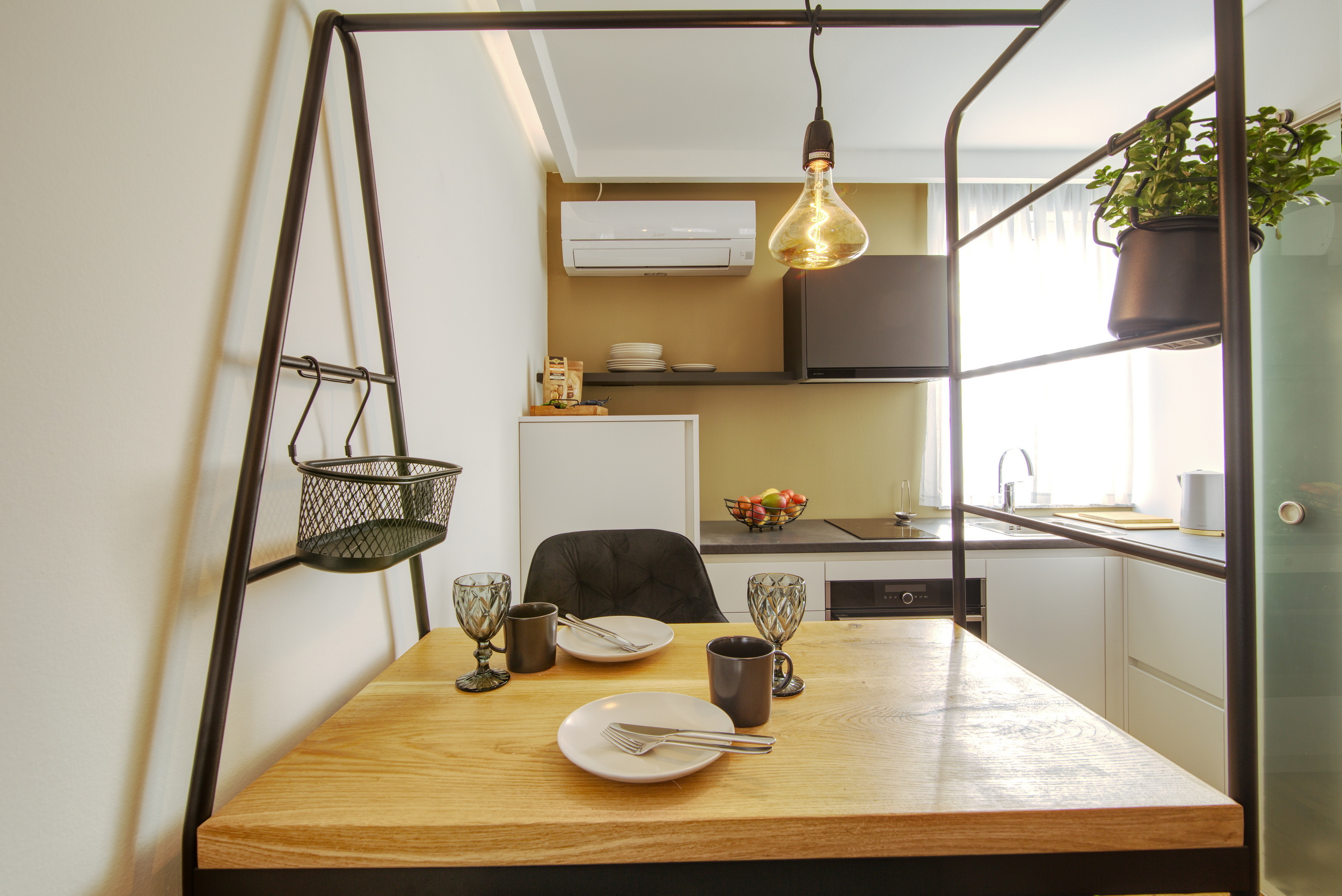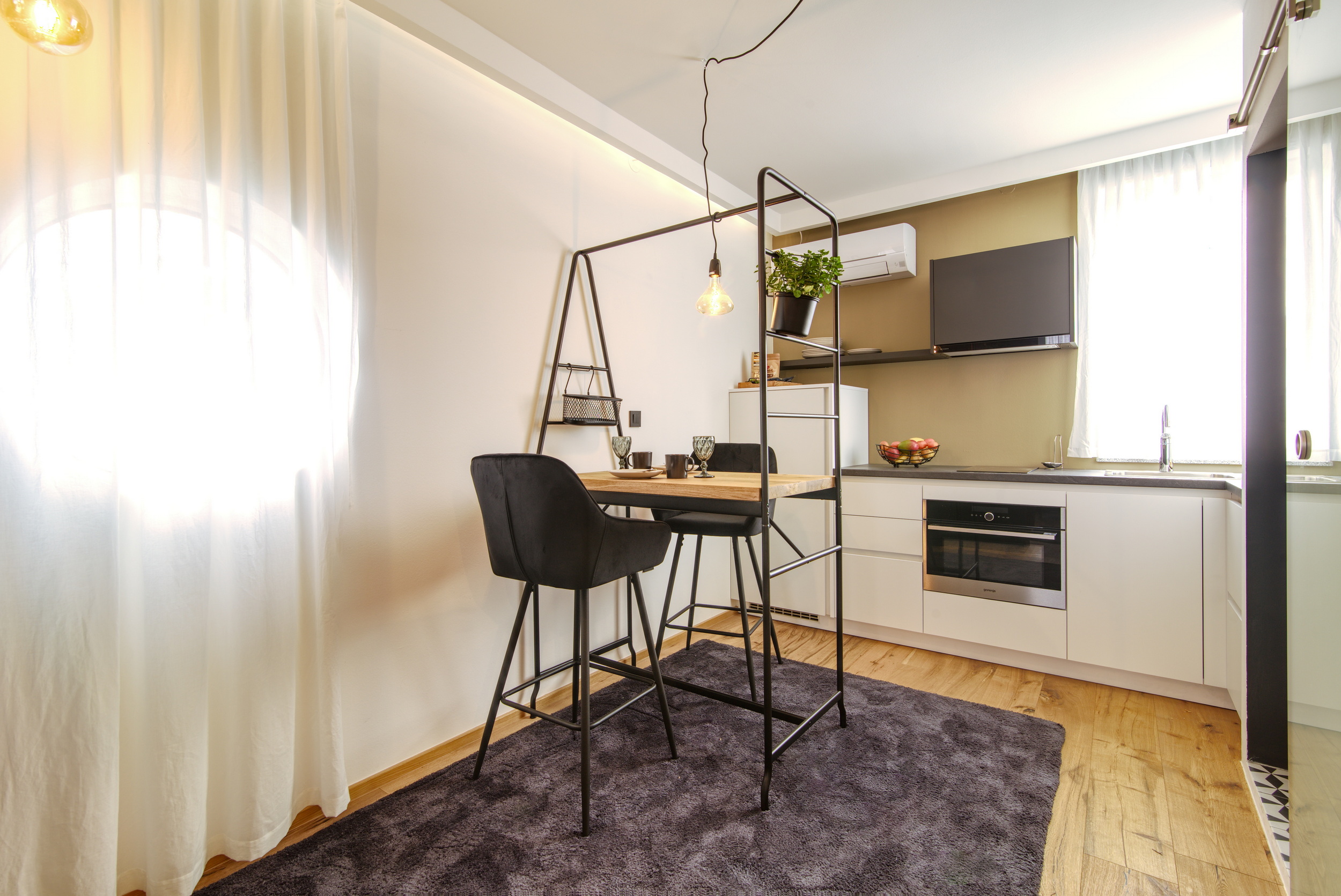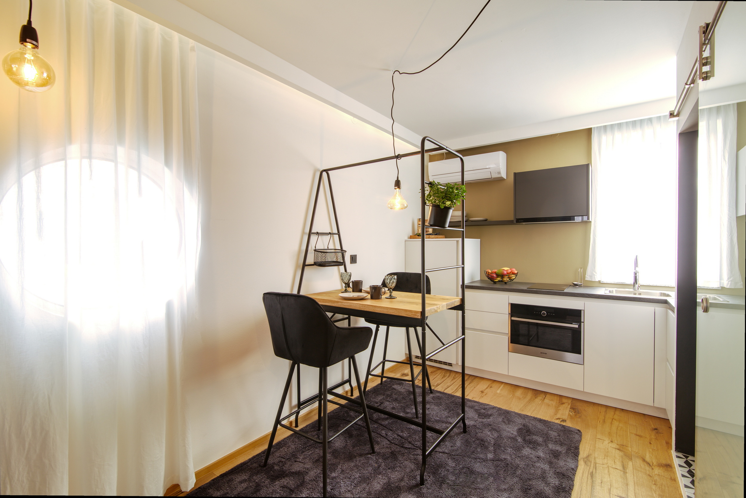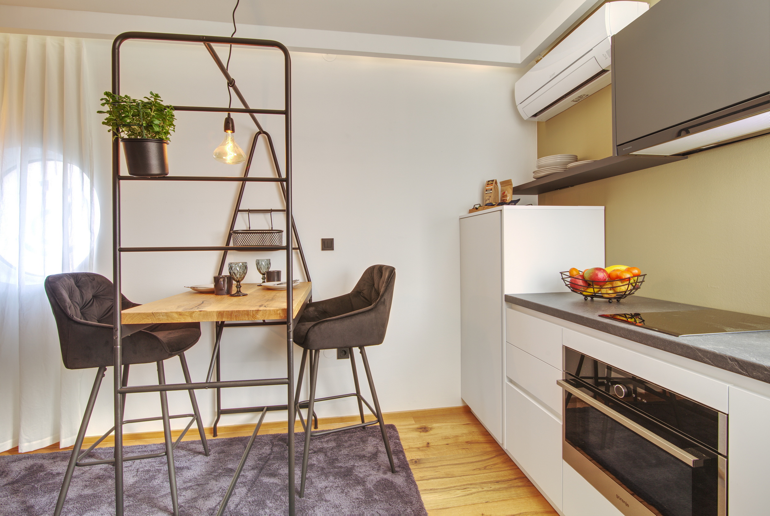 Naš studio apartma je popolnoma opremljen z okroglo zakonsko posteljo, lastno kuhinjo in kopalnico ter klimatsko napravo. Popoln je za solo popotnika ali par, ki išče prijetno in udobno bivanje na odlični lokaciji.