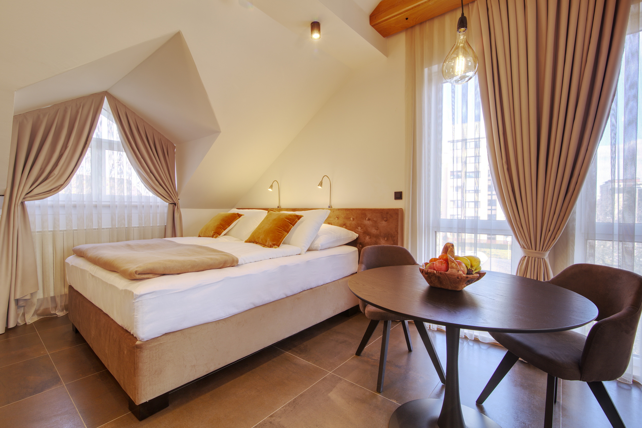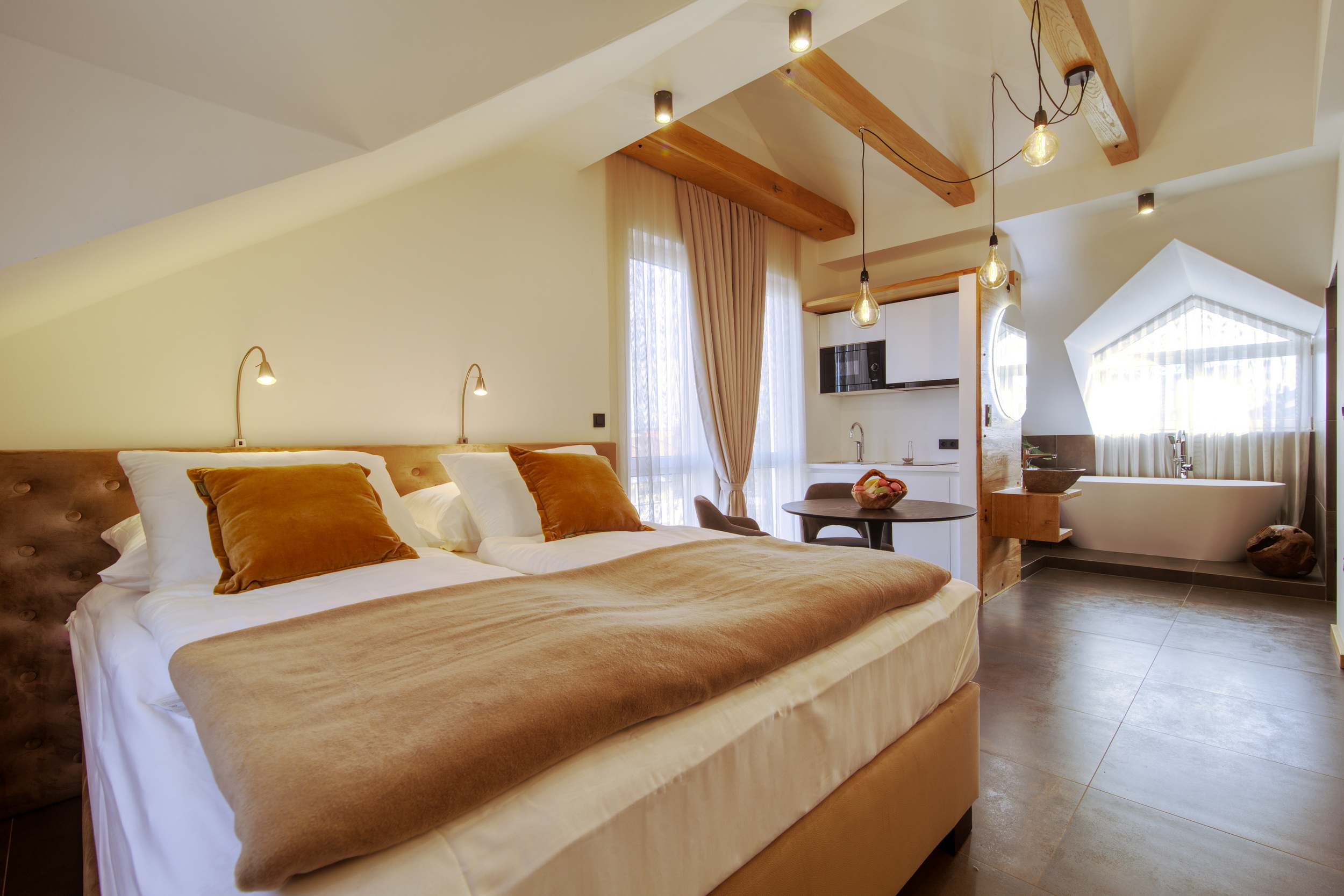 Naš superior apartma za 2 osebi je popolnoma opremljen z zakonsko posteljo in kopalno kadjo, lastno majhno kuhinjo in klimatsko napravo. Je idealen za pare, ki iščejo romantični oddih ali za tiste, ki si želijo urejeno in udobno nastanitev.